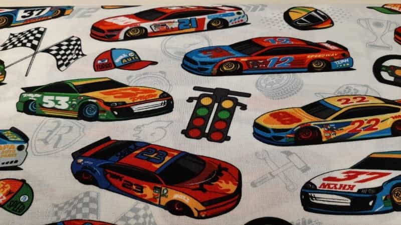 This 100% cotton fabric features a white background with a classic race car print, perfect for creative projects. The material is lightweight and breathable, ensuring comfort all day long. Add this fun design to your next project and let your creativity soar! Price: $6.75.